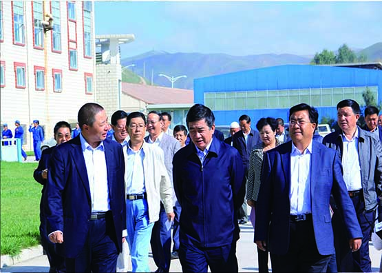 甘南州人大常委會(huì)主任安錦龍(右一)在集團(tuán)董事長(zhǎng)敏文祥(左一)的陪同下視察華羚公司